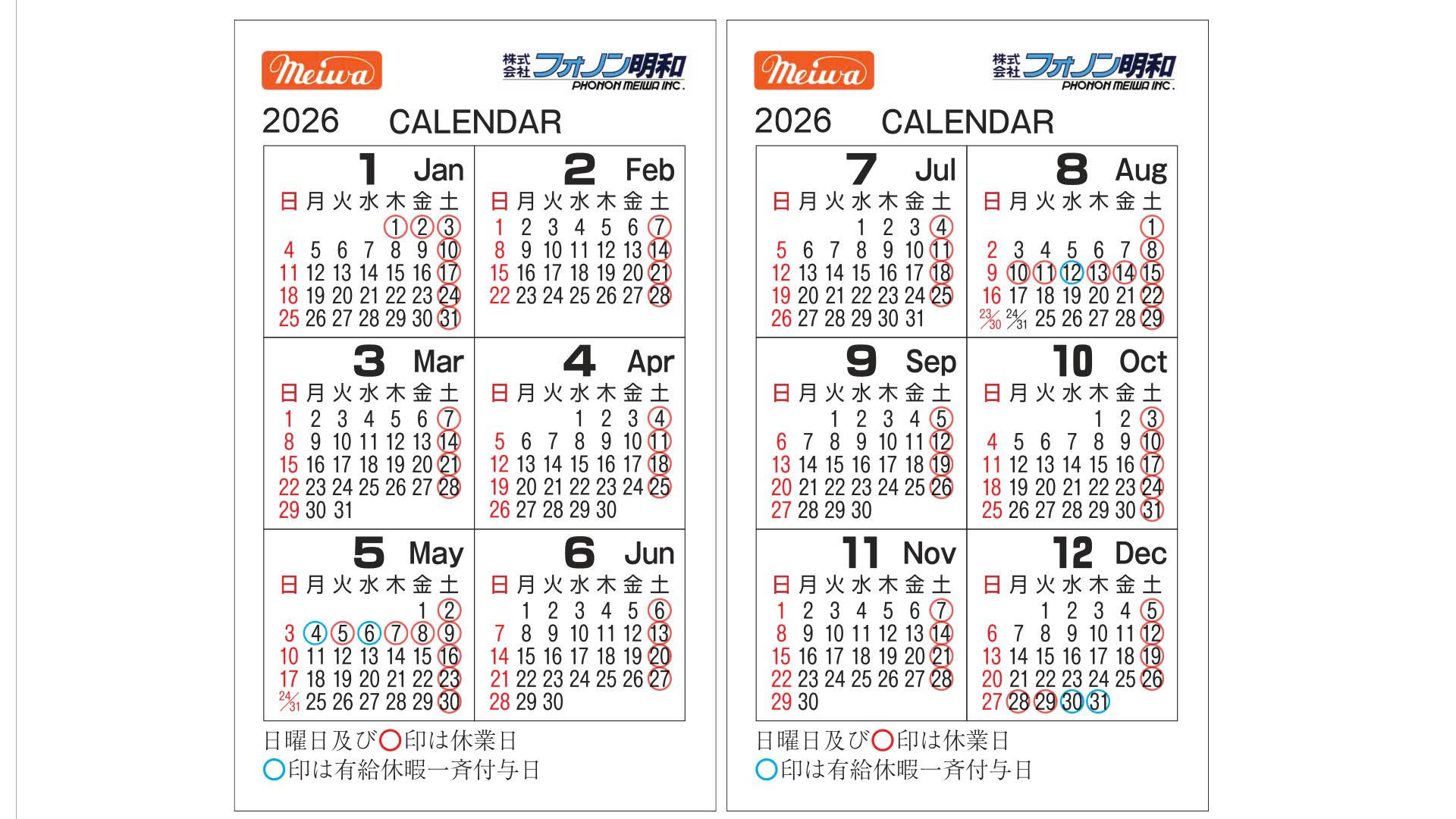 2026年フォノン明和 営業カレンダーを掲載しました。