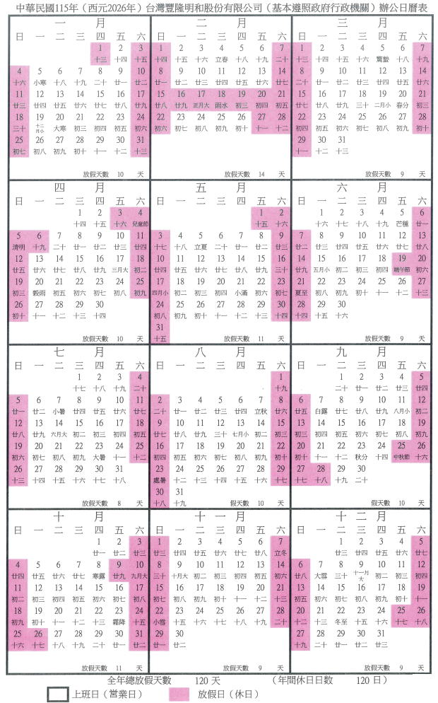 2024年台灣豐隆明和營業日曆